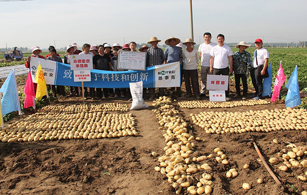 河南鄭州市滎陽高村農(nóng)民黃海望,共種6畝馬鈴薯,其中5畝用的眾德套餐,眾德生物有機肥80公斤,15-10-20高鉀型眾德牌摻混肥100斤在翻地前施用,100斤15-10-20高鉀型眾德牌摻混肥種肥同播,出苗后用態(tài)康科250倍液噴施兩次,另外一畝做對照,同等有機肥,100公斤15-15-15含量的復(fù)合肥作底肥。施用眾德牌摻混肥的馬鈴薯莖葉不旺長,發(fā)根早、根粗、苗壯,中期苗高比對照高15-20厘米,長勢好、病害少,收獲時馬鈴薯個頭大、品質(zhì)好、表面光滑,上市早,賣價高,產(chǎn)量比對照高58-60%,畝產(chǎn)達到6100多斤。